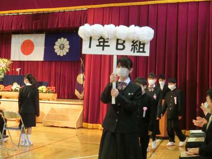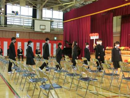 新入生の入場です。緊張気味の面持ちで入場しています。