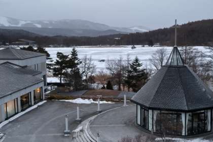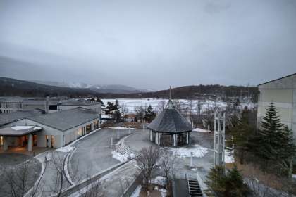 女神湖は氷結して、湖上を車が走っています。(湖上走行の整備をしていました。)