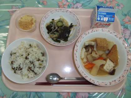 高菜ご飯は、高菜の漬物とごま、ちりめんじゃこを乾煎りし、ご飯に混ぜました。高菜漬けからのしっかりとした塩味と、うま味が出ました。みそ煮込みおでんは、名古屋発祥の料理です。名古屋ではみそを使用した料理がたくさんあります。甘辛く味付けした調味液で野菜や練り製品、鶏肉、生揚げ、いか等を煮込みました。具だくさんな鍋料理で、体の温まる一品となりました。