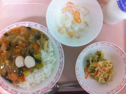 今日は、えびやいか、あさり、ほたてなどの魚介や野菜のたっぷり入った中華丼でした。魚介からうまみが出ています。サラダは、味噌味のドレッシングを給食室で手作りしました。
