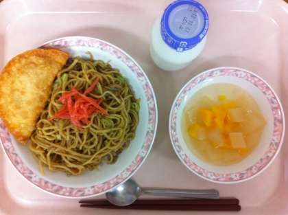ソース焼きそばには、玉ねぎ、にんじん、キャベツ、もやしなど野菜がたくさん入っています。この日は、途中一部水道が止まるというハプニングがありましたが、臨機応変に対応し給食を無事出すことができました。午後の洗い物のことも考え、食器を1つ減らしました。みなさんが楽しみにしていた焼きそばも本当によく食べてくれ、一安心でした。