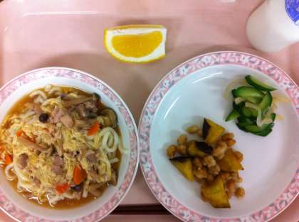 さつまいもと大豆の揚げ煮は、素揚げしたさつまいもと片栗粉をまぶして揚げた大豆に甘辛いたれをからめた料理です。豆嫌いの人も食べやすいメニューで、保護者の方から「家でも作ってと言われました」とうれしい声を聞かせていただきました。けれど、今日も豆だけきれいに残していた人もいたようでした。