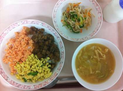 今日のそぼろご飯は、鮭・かんぴょう・炒り卵の三種でした。鮭のそぼろも給食室の手作りで、1度オーブンで焼いてから大きな釜に移し、釜でそぼろ状にしています。切り干し大根の和え物は、ツナを混ぜて酢・砂糖・しょうゆのさっぱりとした味付けになっています。