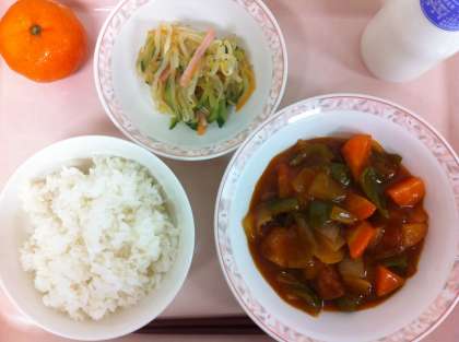 今日は、ケチャップなどで味つけした酢豚でした。豊島区の給食では、たけのこと椎茸の使用を停止しているので、今日は玉ねぎ・にんじん・ピーマン・豚肉の酢豚でした。玉ねぎは素揚げし、豚肉は片栗粉をまぶして揚げ、にんじん・ピーマンは下ゆでしてから、タレとからめています。