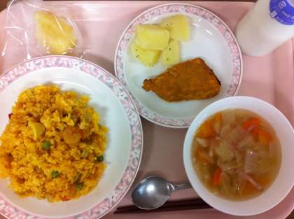 今日のパエリアは、スペインの郷土料理です。本場では、パエジェーラと呼ばれる専用の両側に取っ手のある平底の丸いフライパンで調理します。給食では、ターメリックを混ぜて黄色く炊いたご飯に、えびやいか、タマネギなどの具をトマトピューレとカレー粉、ターメリック、塩こしょうで調味した具を混ぜています。