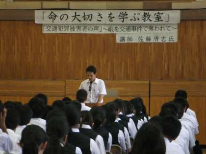 内容3-(4)「生命の尊さを理解し、かけがえのない自他の生命を尊重する」について、幼い娘さんを交通事故で失ってしまったお父様の話を聴かせていただきました。