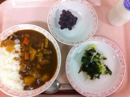 今日は、昨日までに比べ涼しく過ごしやすい気候でした。最終日は、温かいカレーライスだったので、一安心でした。今日は豚肉を使ったカレーでした。果物のデラウェアは、7月下旬から8月上旬にかけてがおいしい時期です。今日は、山梨県産のもので、とても甘いものが届きました。