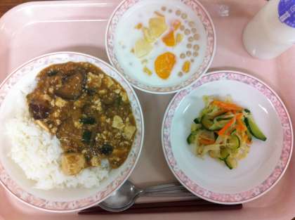 今日は、夏野菜の「ナス」がたくさん入ったマーボー豆腐でした。晴天の多い夏から秋に育ったナスが一番おいしく育ちます。ナスが苦手という人もいるので、献立に悩むのですが、今日はみなさんの大好きなマーボー豆腐に入れました。ナスは別の釜で油で炒めてから最後に混ぜています。丼にしたこともあってか、いつものようによく食べていたので、一安心でした。