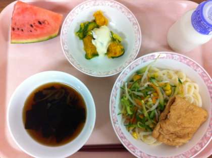 今日は、汁を冷たくした冷やしきつねうどんでした。麺の上には、ゆで野菜と