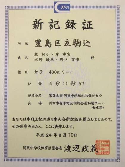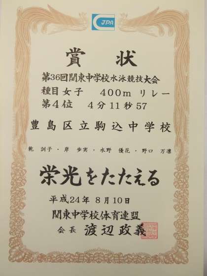 8/9(木)・8/10(金)の2日間、第36回関東中学校水泳競技大会が開催され、水泳部の2年生水野優花さん、佐々木玲衣さん、1年生野口万凜さん、乾訓子さん、岸歩実さんが参加しました。