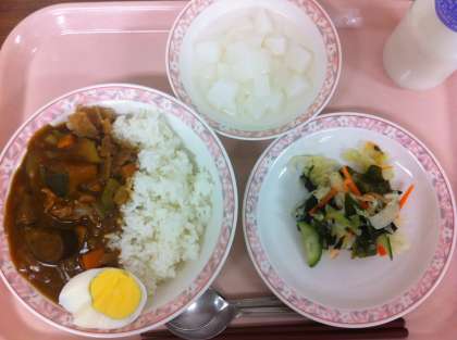 8月31日(金)の給食 公開日 2012/08/31 更新日 2012/08/31 給食 夏野菜カレーライス 福神漬け ゆでたまご わかめサラダ カルピスゼリー 牛乳 今日のカレーは、かぼちゃ、なす、ズッキーニ、ピーマンなど夏野菜たっぷりのカレーライスでした。みなさんが食べるときに、なるべく形が残っているようになすとズッキーニは別に炒め、かぼちゃは蒸かし、ピーマンは下ゆでして最後に入れています。 今日も暑かったせいか、カルピスゼリーはどのクラスも残りなく食べていました。 いいね(0)