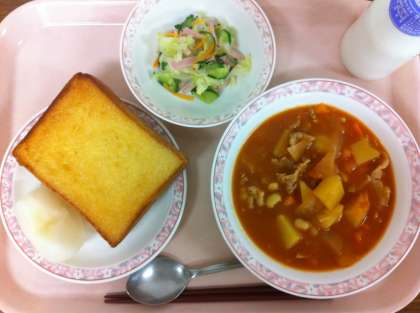 9月5日(水)の給食 公開日 2012/09/05 更新日 2012/09/05 給食 ハニートースト ポークビーンズ ハムサラダ 果物(梨) 牛乳 今日のハニートーストは、グラニュー糖・はちみつ・室温で柔らかくしたマーガリンを混ぜて、食パンに塗りオーブンで焼いています。グラニュー糖のカリッという食感とはちみつの風味があります。分量を載せますので、ぜひご家庭でもお試しください。 (2枚分) ☆グラニュー糖 6g ☆はちみつ 20g ☆マーガリン 17g いいね(0)