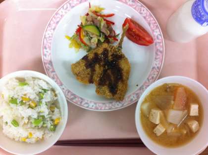 7月13日(金)の給食 公開日 2012/07/13 更新日 2012/07/13 給食 枝豆とコーンのご飯 アジフライ トマト カラフルソテー 味噌けんちん汁 牛乳 今日は、アジの開いたものを魚屋に注文し、フライにしました。アジの旬は5〜7月にかけてです。今日は長崎県産のアジを使っています。また、カラフルソテーは、赤・黄・緑の3色のピーマンとズッキーニを使った炒め物でした。味つけは、塩胡椒・しょうゆ・オイスターソースです。彩りのきれいな炒め物でした。 いいね(0)