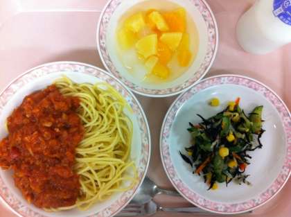 今日のスパゲティは、ツナがたっぷり入ったトマトソースがかかっています。みじんにしたにんにく、セロリ、にんじん、玉ねぎ、短冊に切ったベーコンを炒め、トマト缶、ピューレ、ケチャップ、塩胡椒などで調味し、油を切ったツナを加えたソースです。