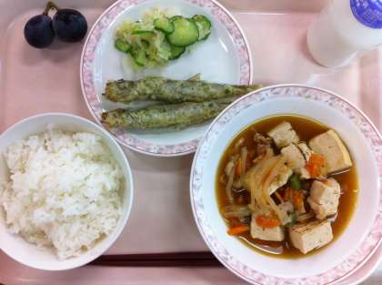 9月27日(木)の給食 公開日 2012/09/27 更新日 2012/09/27 給食 ご飯 ししゃもの磯辺揚げ 浅漬け すき焼き風煮 果物(巨峰) 牛乳 今日のすき焼き風煮には、豚肉を使っています。にんじん、たまねぎ、糸こんにゃく、焼き豆腐、さやいんげんが入っています。お豆腐は、1人100gも使っています。お豆腐屋さんに固めに押してきてもらい、作るときもなるべく崩れないように気をつけています。 いいね(0)