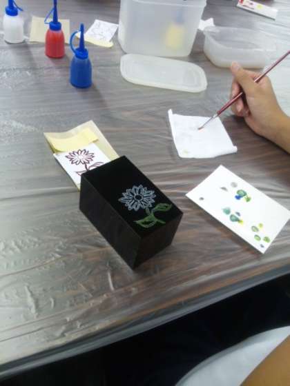 昨晩の宿での体験学習です。 京漆器の加飾、みんな真剣でした。
