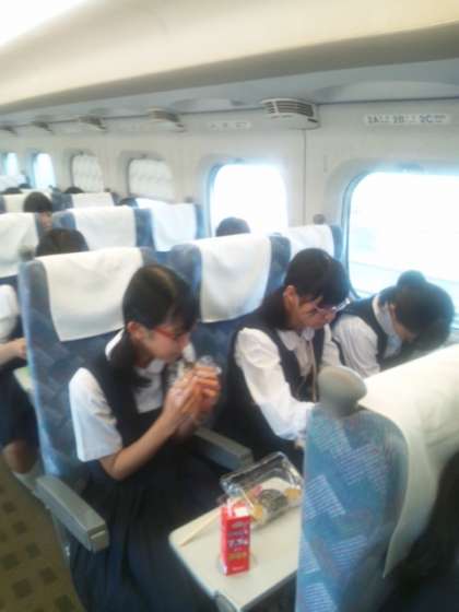 名古屋を過ぎました。 家からもって来たお弁当と、配られたリンゴジュースで、早めのお昼ご飯です。