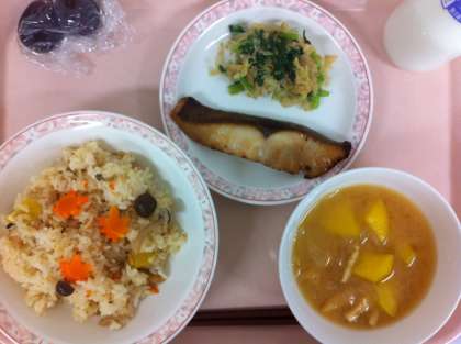 今日は、秋を感じられる献立になっています。秋の山路ご飯には、栗、油揚げ、にんじん、しめじが入っています。旬の栗と、もみじ型に型抜きしたにんじんが入っています。配膳するときに、3年生の生徒が「これ切るの大変だっただろうな〜」と言ってくれました。また、お味噌汁にもさつまいもが入り、ぶどうも八百屋さんが粒の大きいピオーネを納品してくださいました。「給食を食べて秋を感じました♪」と言ってくれたので、よかったです。