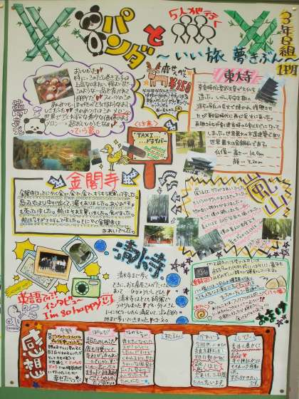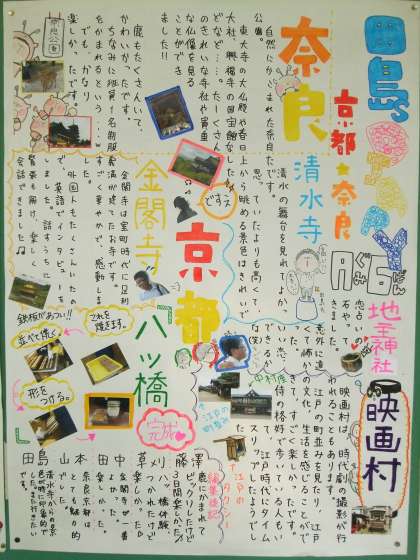 3年生教室の廊下側に、修学旅行のようすをまとめた壁新聞を掲示しています。どれも力作ばかりです。ご来校の際ぜひご覧下さい。