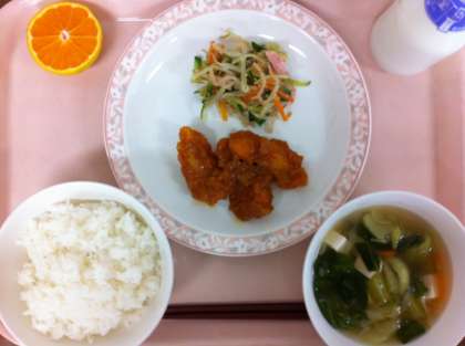 今日のイカチリソースは、20gの切り身を1人3切れでした。いかは塩胡椒で下味をつけ、片栗粉をまぶして揚げています。みじんにしたしょうが、にんにく、玉ねぎ、ねぎを炒め、ケチャップやチリソース、豆板醤などで調味したタレをいかにからめています。「今日の給食サイコウ!」と言ってくれた人もいました。