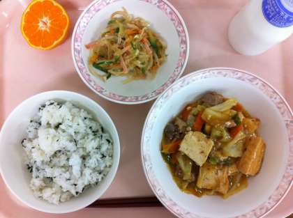 今日は人気メニューの1つ、わかめご飯でした。駒込中のわかめご飯には、わかめに加えごまとじゃこも入っています。また、春雨サラダもよく食べてくれました。給食で使用する春雨は、国産のさつまいもデンプンから作られたものです。つるっとしていて、サラダによく合います。全クラス完食してくれました♪
