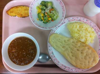 今日は、ひき肉の入ったキーマカレーでした。ナンとカレー粉、ターメリックで色づけしたご飯と一緒に食べました。スイートポテトも給食室の手作りです。さつまいもは裏ごしし、砂糖、バター、バニラエッセンス、牛乳を混ぜます。1つ1つ丁寧に形作り、はちみつとみりんを混ぜたものを塗り、オーブンで焼きました。焼き上がったときには、とてもいい香りが漂っていました。