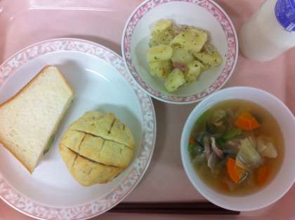 9月19日(水)の給食 公開日 2012/09/19 更新日 2012/09/19 給食 手作りメロンパン ハムサンド ジャーマンポテト 野菜スープ 牛乳 今日から2年生が職場体験、3年生が修学旅行のため、1年生のみの給食でした。いつもは作るのが難しい手のかかるメニューになっています。 メロンパンは、上のクッキー生地が手作りです。丸パンの上にクッキー生地をのせ、格子に模様をつけ、オーブンで焼きました。市販のものより甘さ控えめの素朴な味になっています。 いいね(0)