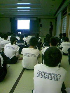 ・夕食後、山岳ガイドの吉田さんから尾瀬の講話を聴いています。