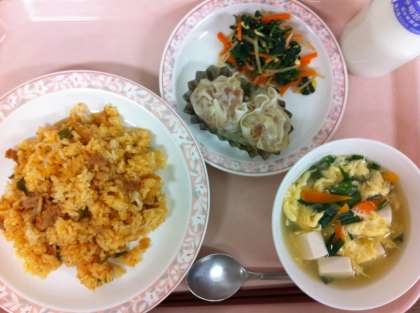 今日も1年生のみの給食でした。今日は、給食室でえびシュウマイを手作りしました。シュウマイは、えびのすりみ、豚ひき肉、塩こしょうを練り、みじんにしたねぎ、しょうゆ、ごま油、片栗粉を混ぜ、シュウマイの皮に包みます。アルミにせんキャベツとシュウマイ2個をのせ、スチームコンベクションオーブンで15分蒸しました。