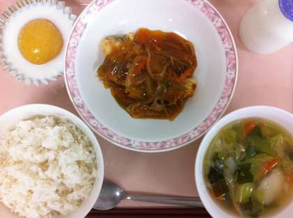 今日は、冬が旬の鱈を使った料理でした。片栗粉と小麦粉をまぶして唐揚げにして、ケチャップの入った甘酢あんをかけて食べました。おかしな目玉焼きは、国産の黄桃をアルミに並べ、牛乳寒を注いで冷やし固めています。見た目が