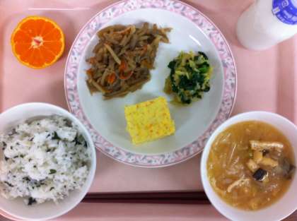 今日の厚焼き卵は、にんじん、鶏ひき、玉ねぎ、ねぎが入っています。炒めてから調味し、たまごと混ぜてオーブンで焼いています。わかめご飯は、人気の混ぜご飯で今日もよく食べていました。
