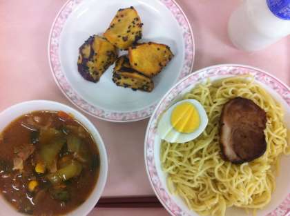 今日は、つけ麺風の味噌ラーメンでした。玉ねぎ、豚肉、にんじん、もやし、きくらげ、チンゲンサイなど具だくさんの汁に中華麺をつけて食べました。麺は盛りつけやすいように、調理員さんが1人1玉ずつ丸めて配缶してくれています。