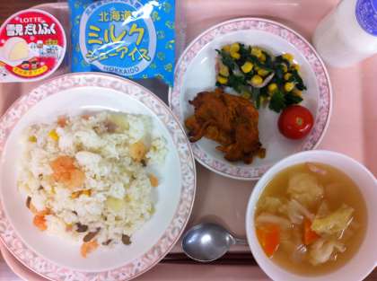 今日は、クリスマス献立でした。タンドリーチキンは、鶏のもも肉を塩胡椒、にんにく、しょうが、ケチャップ、ヨーグルト、カレー粉、ターメリック、パプリカ、レモン汁、チリパウダーの調味液につけ込み、オーブンで焼きました。アイスクリームのリザーブは、駒中恒例サンタさんが届けてくれ、大いに盛り上がりました。