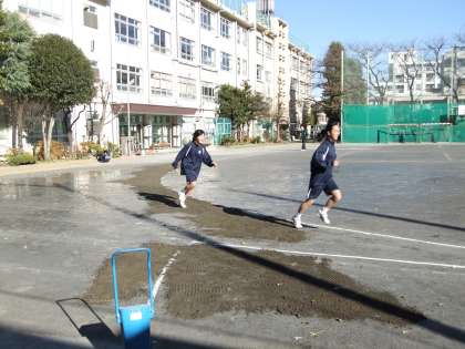 12/26(水) バスケットボール部は、高島一中・順天中・赤羽岩淵中と練習試合です。校庭では陸上部がぬかるんだグランドを整備しながら練習しています。琴部や吹奏楽部も頑張っています。