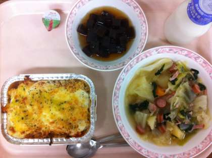 9月21日(金)の給食 公開日 2012/09/21 更新日 2012/09/21 給食 エビドリア ポトフ コーヒーゼリー 牛乳 今日も1年生のみの給食でした。今日のドリアは、えびのたっぷり入ったチキンライスの上にホワイトソースをかけ、チーズをのせて焼いています。ホワイトソースも給食室の手作りです。コーヒーゼリーは、いつもより苦さ控えめに作りました。 いいね(0)
