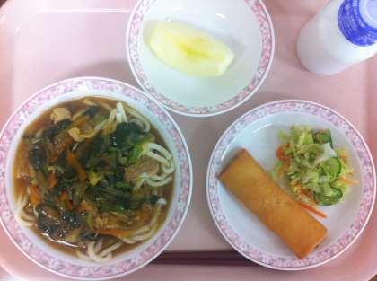 今日のポテト春巻きは初メニューです。蒸したじゃがいもをマッシュして、コーンとハム、塩胡椒、バターを混ぜ、牛乳で固さを調節して春巻きの皮に包み揚げています。おやつにもぴったりの一品です。