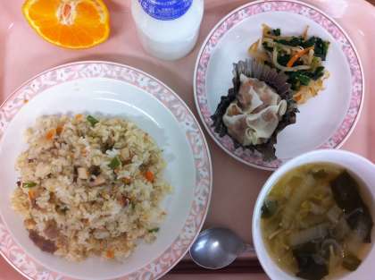 今日のシュウマイは給食室の手作りです。豚ひき肉とえびのすり身、ねぎ、調味料をよく混ぜて1つ1つシュウマイの皮につつみ、蒸し上げました。1人1個なので、前回より大きめで、皮も特注の11センチのもので作っています。よく食べてくれたので、一安心でした。