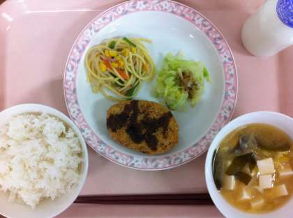 今日のコロッケは、大豆と白インゲン豆が入っています。豆の形が残っていると抵抗のある人もいるようですが、コロッケにして芋と一緒につぶすとよく食べてくれました。給食室では、熱々のじゃがいもをマッシュしたり1つずつ丁寧に丸めたり、大変な作業です。爆発しないように、いったん冷凍庫で冷やしてから上げる工夫をしています。食べ残し0!なので、一安心でした。