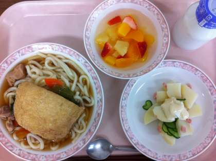 今日のきつねうどんには、揚げが1人1枚のっています。油揚げがきつねの好物、色やうずくまる形が似ていることから、きつねうどんと言われるようになったそうです。給食では約250枚の油揚げを大きな釜で油抜きし、甘辛く煮ています。砂糖:しょうゆ2:3の割合でだし汁と合わせて煮ました。調理さんがやぶれないように、丁寧に煮てくれました。