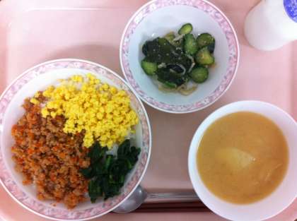 3色そぼろご飯、味噌汁、ごま酢和え、牛乳