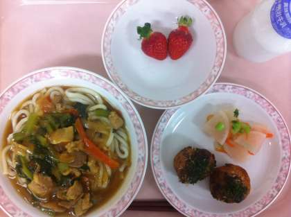カレーうどん、たこ揚げくん、かぶの浅漬け、果物(いちご)、牛乳