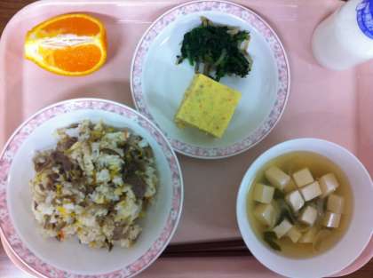 今日は、混ぜご飯をとてもよく食べてくれました。豚肉はしょうゆと酒で下味をつけておき、ごぼう、にんじんと一緒に炒めて、酒、しょうゆ、塩、みりんで調味し、炊いたご飯に混ぜています。磯香和えは、刻みのりを野菜と和えています。