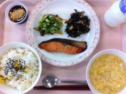 今日は和食メニューでした。さつまいもご飯は、リクエストメニューに上がっていました。角に切ったさつまいもをお米と一緒に炊いています。黒糖寒天は、黒糖と寒天を煮溶かして冷やし固め、上にきなこをふっています。