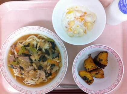 今日は、新たまねぎと豚肉のたっぷり入ったうどんでした。玉ねぎと豚肉を炒め、昆布と鰹節でとっただし汁を注ぎ、調味、片栗粉でとろみをつけています。大学芋は、盛りつけしやすいように、1人4個になるよう数えて切っています。