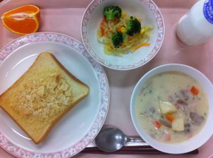 今日のクラムチャウダーには、あさりとほたての水煮が入っています。あさりは3月から4月にかけてがおいしい時期です。クラムチャウダーは、貝の風味の出たクリームスープで、今日は牛乳と豆乳を混ぜて仕上げました。