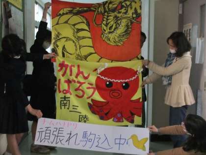 駒込中では3.11の震災後、南三陸町立志津川中学校と交流を深めてきている関係から、特別応援団を編制しました。コースに立って、みんなで作った応援旗を振って、豊島区のチームと南三陸町のチームを応援します!!