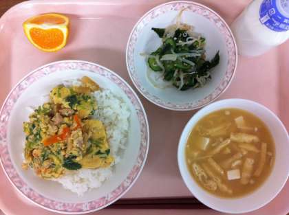 今日の親子丼は、たまごが1人約1個分入っています。かつお節でとっただしを濃いめに調味し、玉ねぎ、にんじん、鶏肉を煮て、天板に具とたまご、三つ葉を流し入れ、オーブンで加熱しています。どのクラスもほとんど残りなく食べてくれました。