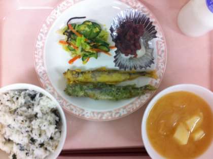今日のししゃもの2色揚げは、あおのりとカレーの衣をつけた2色です。また、わかめご飯にはじゃこも入り、小魚のカルシウムたっぷりの献立です。小豆白玉は、1人3個の白玉がのっています。