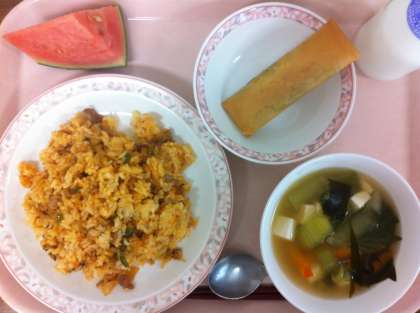 今日の春巻きは、アスパラが1人1本分入っています。アスパラは、春から初夏にかけて特に5月がおいしい時期です。今日は、春巻きの皮にハムとチーズと一緒に包んで揚げました。また、今日は今年度初めてのすいかでした。「ひとりじめ」という品種のすいかで、みずみずしくおいしいものを納品していただきました。今日はとても暑かったので、喜ばれたようです。