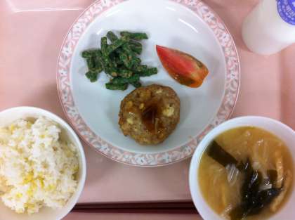 今日のハンバーグは、ひき肉のほかに豆腐を混ぜた和風ハンバーグです。みじんにした新たまねぎやにんじんをしっかり炒めて、混ぜ合わせています。給食室では約250ヶのハンバーグを5人で作っています。上に甘辛いたれをかけて食べました。